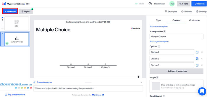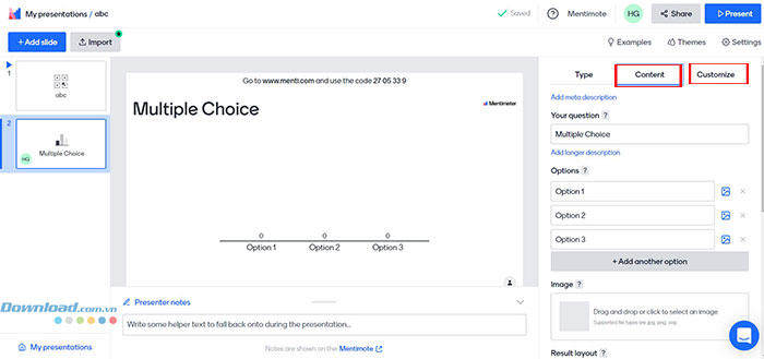 Cuộc thi câu đố cho phép chọn câu trả lời và loại câu trả lời. Sau khi chọn loại câu hỏi, nội dung slide, người dùng cần nhập câu hỏi và câu trả lời ở tab Content ở khu vực làm việc bên phải màn hình. Nhấn vào Customize để tùy chỉnh giao diện và chức năng của slide.