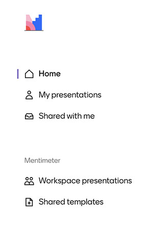 Home là trang bắt đầu sau khi đăng nhập vào tài khoản Mentimeter, có thể nhấp vào logo Mentimeter ở góc trên bên trái để quay lại màn hình này. Từ đây, người dùng có thể tạo và truy cập các bài thuyết trình gần đây của mình chỉ bằng một vài cú nhấp chuột.