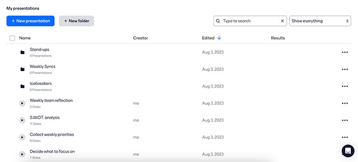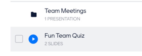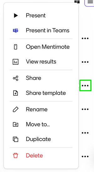 Nhấp vào ba dấu chấm ở bên phải bài thuyết trình để mở menu cho các hành động khác nhau như đổi tên bài thuyết trình, di chuyển bài thuyết trình vào thư mục, xem kết quả hoặc mời cộng tác viên.