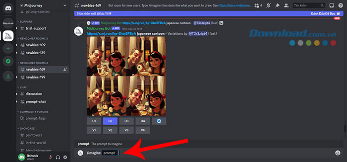 Để tạo một hình ảnh, hãy sử dụng lệnh /imagine theo sau là một đoạn mô tả văn bản ngắn, được gọi là Prompt, để chỉ định loại hình ảnh mong muốn. Sau đó, bot sẽ tạo ra một hình ảnh duy nhất dựa trên văn bản đã nhập.