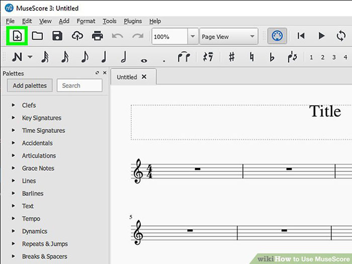 Bước 1: Nhấn Ctrl + N trên bàn phím hoặc click vào nút có hình trang và dấu cộng ở góc trên bên trái để tạo một Score mới.