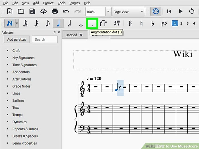 Bước 2: Nhấn vào nốt nhạc muốn thêm dấu chấm dôi vào. Sau đó nhấn vào dấu . trên bàn phím hoặc Augmentation Dot ở trên thanh công cụ.