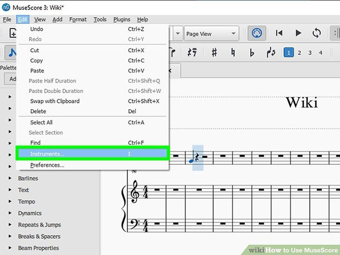 Bước 1: Nhấp vào Edit trên thanh menu và chọn Instruments để truy cập menu nhạc cụ. Mọi người cũng có thể nhấn I để mở menu này.