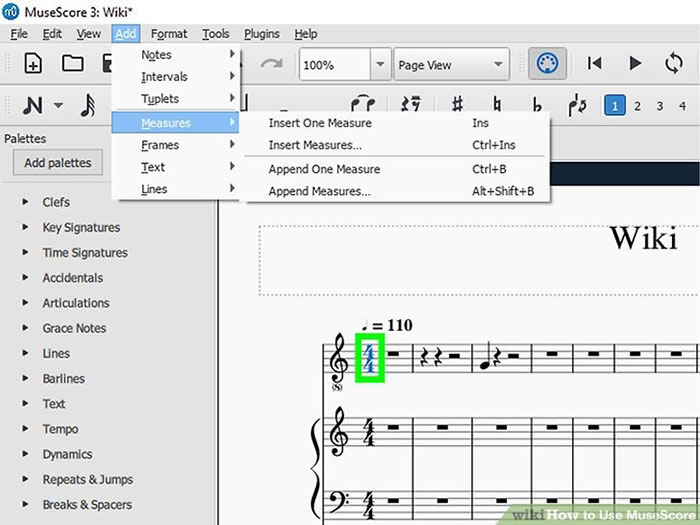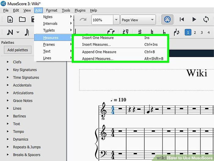 Bước 2: Nhấn vào Add trên thanh menu. Cuộn qua Measures và chọn Insert One Measure (chỉ thêm một) hoặc Insert Measures (thêm nhiều). Tiết nhịp sẽ được chèn vào bên trái của bar đã chọn.