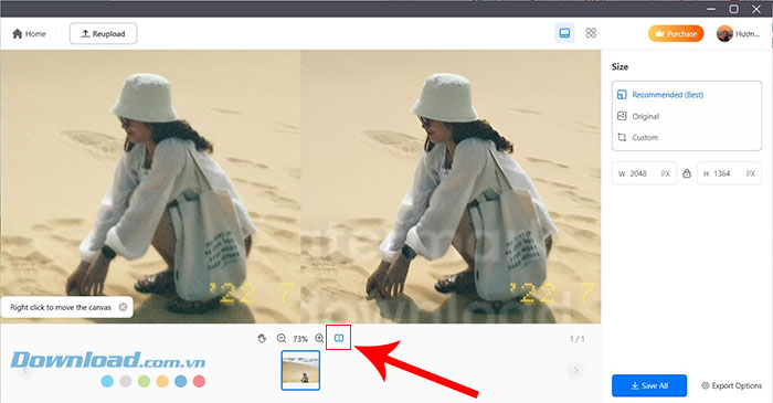 Bước 2: Chờ đợi ứng dụng hoàn tất quá trình làm nét ảnh, nhấn vào biểu tượng hình chữ nhật để xem sự so sánh trước và sau khi làm nét ảnh.