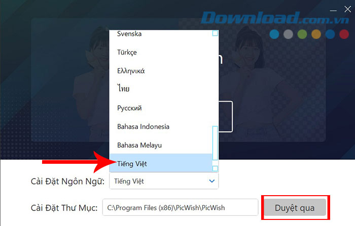 Bước 3: Chọn Tiếng Việt trong Cài Đặt Ngôn Ngữ và nhấn Duyệt qua để chọn thư mục lưu trữ.