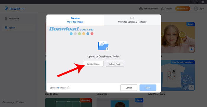 Bước 2: Nhấn nút Upload Image và chọn một hình ảnh muốn loại bỏ phần nền.