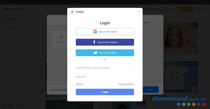 Bước 4: Nếu chưa đăng nhập vào PicWish, mọi người cần đăng nhập bằng Google, Facebook hoặc Twitter để sử dụng các tính năng miễn phí.