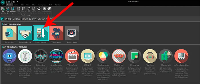 Có một số cách để nhập tệp vào VSDC. Đầu tiên, người dùng có thể sử dụng biểu tượng Import content trên màn hình bắt đầu khi khởi chạy chương trình. Đây là cách tối ưu vì VSDC sẽ tự động phát hiện tất cả các thông số của video và điều chỉnh các thông số của dự án cho phù hợp. Sau khi chọn tệp trên PC, một cửa sổ sẽ bật lên hỏi người dùng có muốn thay đổi độ phân giải, tốc độ khung hình hay các thông số khác không. Khi đã sẵn sàng, hãy nhấn Finish.