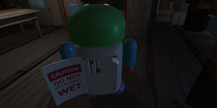 Khi đi xung quanh robot, mọi người có thể nhìn vào lưng của nó để tìm một bảng điều khiển. Có 2 điều quan trọng cần lưu ý bên trong ngăn này: một là Blabbot bị thiếu pin và hai là không được để Blabbot bị ướt.