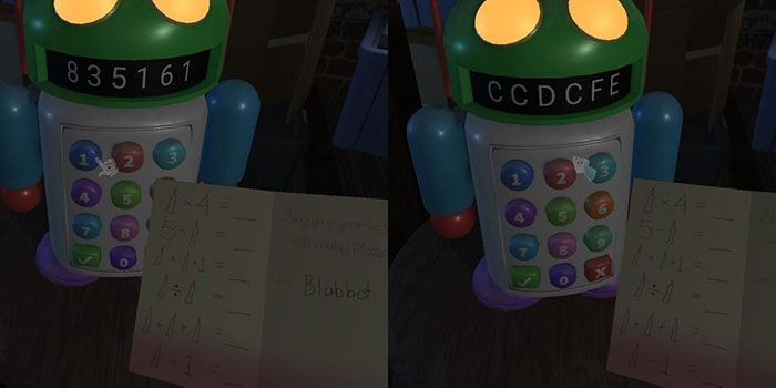 Tiếp theo, đặt nến lên bánh và sau đó nhặt tấm thẻ. Thẻ này có một số phương trình bên trong nó. Nếu người chơi thay thế tất cả các hình vẽ nến bằng số nến trên bánh (hiện là 2), sẽ ra mã Blabbot thứ ba là 835161.