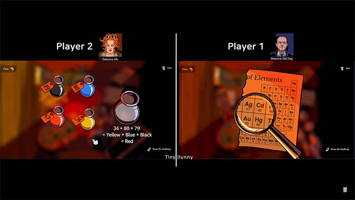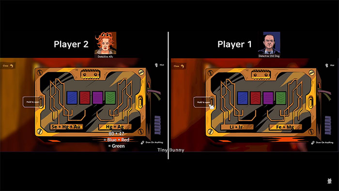 Cả hai người chơi nhìn vào thiết bị điện ở phía trên bên trái, lưu ý tổng số nguyên tố mà mình cần để giải đó. Cả 2 nên truyền đạt những điều này cho người còn lại, vì mọi người sẽ cần tìm chúng trong bảng tuần hoàn một phần ở trên cùng bên phải, sau đó trộn các màu thích hợp bằng cách sử dụng bột màu ở giữa hộp, cụ thể như sau: