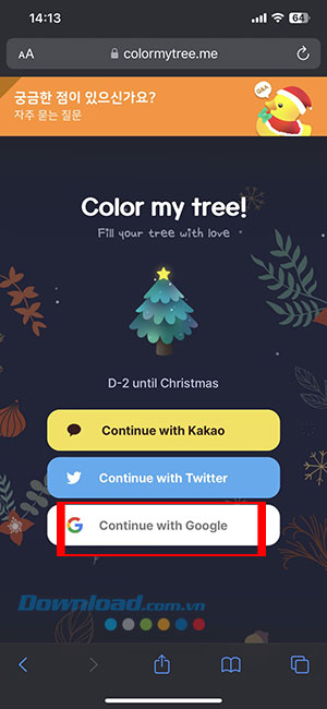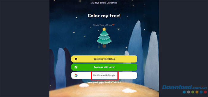 Bước 1: Truy cập đường dẫn https://colormytree.me/ và nhấn vào Continue with Kakao, Naver hoặc Google để đăng nhập vào tài khoản.