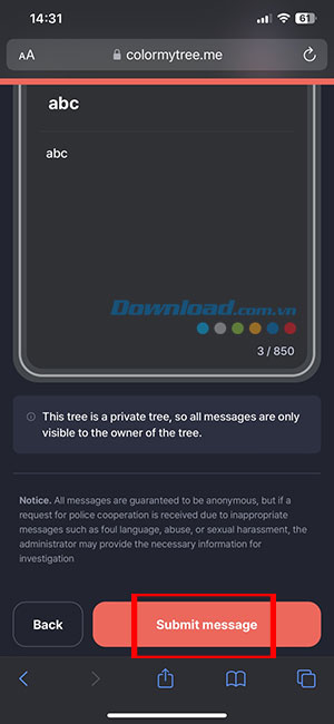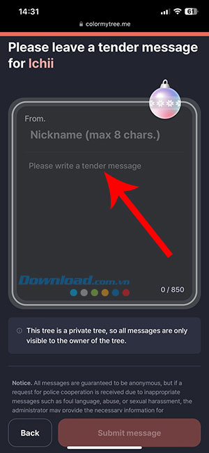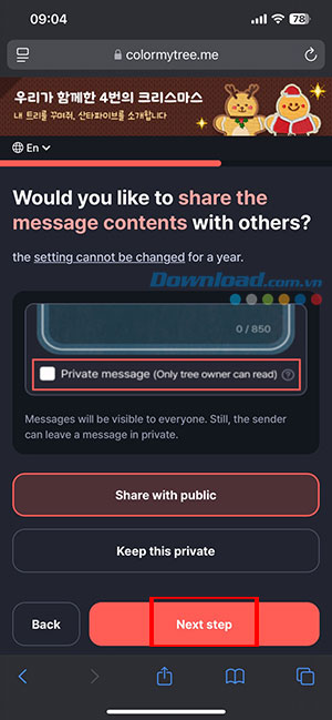 Tiếp theo, Colormytree sẽ hỏi mọi người có muốn tiết lộ công khai nội dung tin nhắn của mình với những người khác không. Nếu muốn tiết lộ đầy đủ để bất kỳ ai cũng đọc được khi truy cập cây thông của mình, hãy chọn tùy chọn số 1. Ngược lại, nếu chỉ muốn giữ nội dung lời nhắn riêng cho mình, chọn lựa chọn số 2. Nhấn nút màu đỏ khi đã chọn xong.