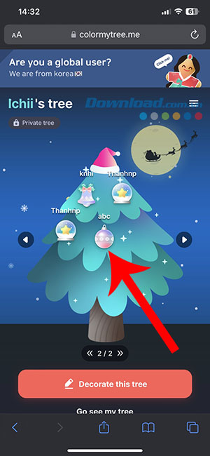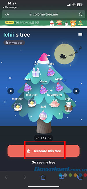 Bước 1: Sau khi nhận được đường link tới cây thông, người nhận sẽ có 2 tùy chọn là Decorate this tree và Go to see my tree. Nhấn vào Decorate this tree để gửi lời nhắn.