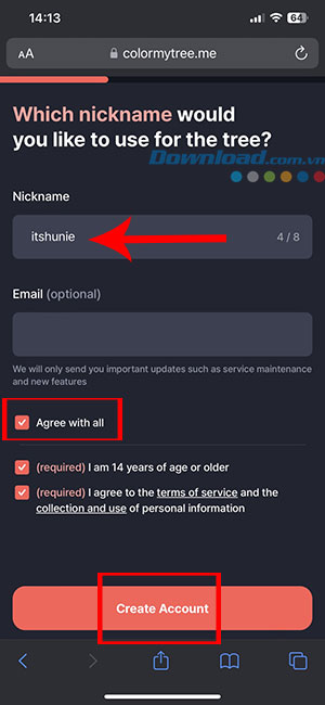 Bước 3: Nhập Nickname và Email (tùy chọn) của mình vào ô tương ứng. Sau đó tích vào Agree with all để chấp nhận điều khoản. Cuối cùng nhấn nút Create Account.