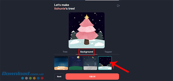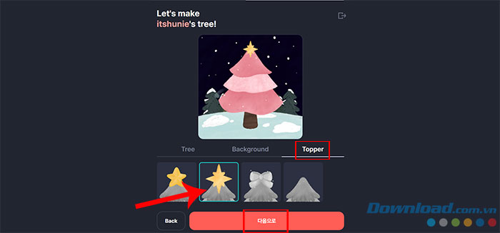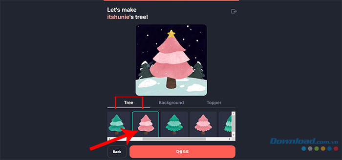 Bước 2: Bắt đầu thiết kế cây thông bằng cách chọn Tree (kiểu cây thông), Background (hình nền) và Topper (đồ trang trí trên đỉnh cây). Sau khi hoàn tất trang trí cây, nhấn Next step.