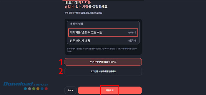 Đầu tiên, Colormytree sẽ hỏi mọi người muốn ai có thể để lại lời nhắn trên cây thông cho mình, click vào lựa chọn số 1 để bất kỳ ai cũng có thể gửi tin nhắn, chọn lựa chọn 2 nếu chỉ muốn người người đăng nhập tài khoản mới gửi được. Sau khi chọn xong, tiếp tục nhấn nút đỏ.
