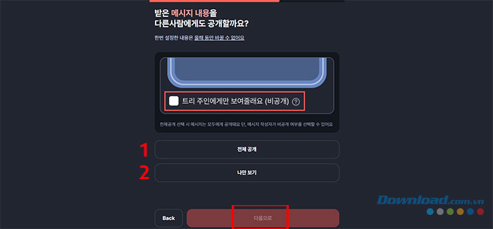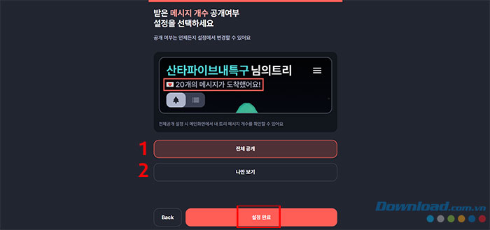 Cuối cùng, người dùng sẽ cần lựa chọn hiển thị số lượng tin nhắn mình nhận được công khai hay riêng tư. Chọn tùy chọn số 1 để tiết lộ đầy đủ số lượng tin nhắn mình đã nhận được, chọn tùy chọn số 2 để chỉ có chính mình xem được thông tin này. Sau khi chọn xong, tiếp tục nhấn nút đỏ.