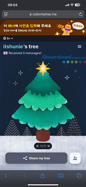 Bước 5: Vậy là cây thông Colormytree đã được tạo xong và mọi người có thể nhấn nút màu xám để sao chép liên kết cây thông của mình, chia sẻ nó lên mạng xã hội để bạn bè truy cập và gửi lời nhắn Giáng Sinh.
