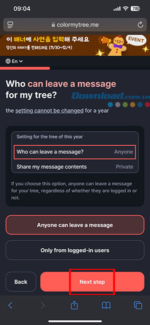 Bước 3: Lựa chọn đối tượng có thể gửi lời nhắn trên cây thông của bạn. Chọn Anyone can leave a message nếu muốn bất kỳ ai cũng có thể để lại lời chúc trên cây, hoặc chọn Only from logged-in user để người dùng đăng nhập Colormytree mới gửi được lời nhắn. Sau đó nhấn Next step.