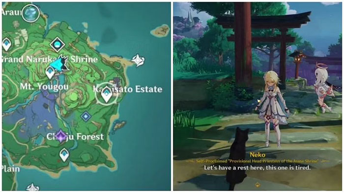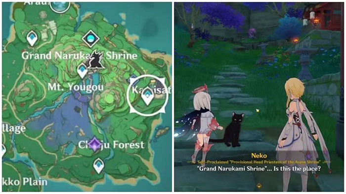 The Narukami Trail rất dễ hoàn thành vì nó chỉ bao gồm các đoạn hội thoại với NPC. Đầu tiên, Traveler cần đến Asase Shrine và nói chuyện với Neko để kích hoạt nhiệm vụ.