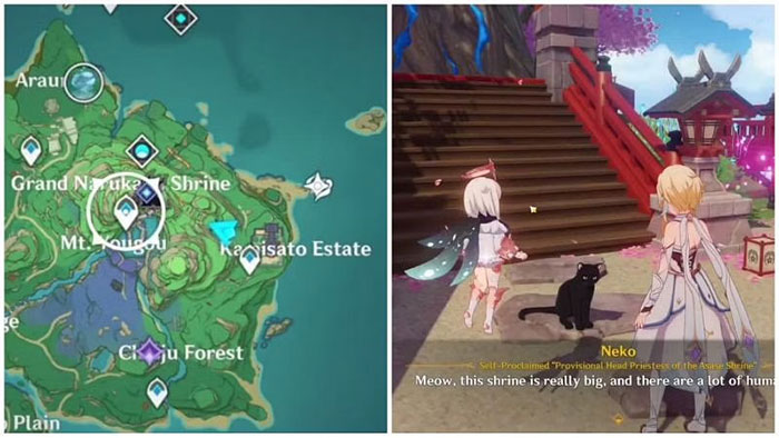 Sau đó, nói chuyện với Neko một lần nữa ở gần Kamisato Estate. Chú mèo biết nói và Traveler sẽ đến Đền Grand Narukami để nói chuyện với một thiếu nữ ở đó.