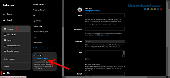 Bước 2: Nhấn vào More ở góc dưới cùng bên trái, chọn Settings. Sau đó nhấn vào Accounts Center.