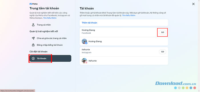 Bước 4: Nhấn nút Gỡ bên cạnh tài khoản muốn hủy liên kết và thực hiện tương tự các bước như ở phần trên.