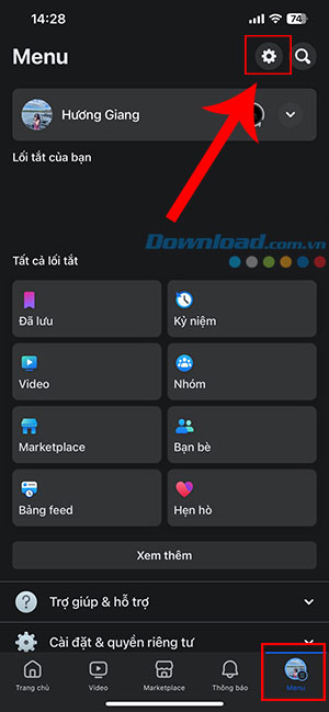 Bước 1: Mở Facebook và truy cập tab Menu. Sau đó, nhấn vào biểu tượng bánh răng cài đặt ở góc trên cùng bên phải.