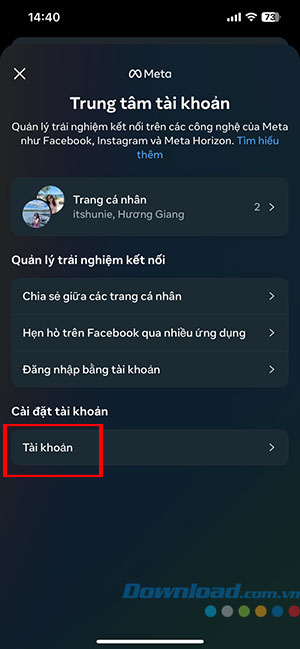 Bước 2: Nhấn vào Xem thêm trong Trung tâm tài khoản và chọn Tài khoản.