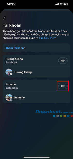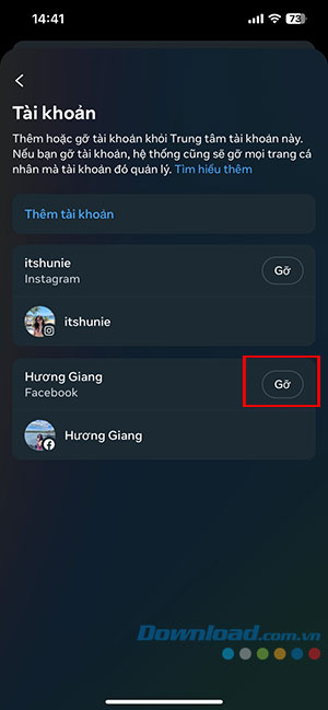 Bước 3: Nhấn vào nút Gỡ bên cạnh tài khoản muốn hủy kết nối khỏi tài khoản của mình.