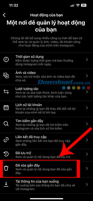 Bước 3: Tiếp tục chọn Đã xóa gần đây và danh sách các Story mọi người đã xóa sẽ xuất hiện.