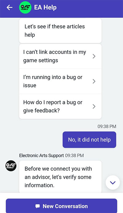 Nếu là người bị mất tài khoản FC Mobile ngay cả khi đăng nhập Facebook hoặc Google Play Games, hãy xem qua tùy chọn Customer Service trong trò chơi từ menu Settings hoặc từ trang web trợ giúp chính thức của EA.