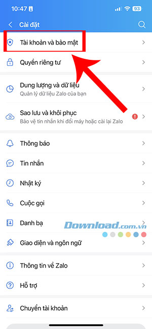 Bước 2: Nhấn vào tùy chọn Tài khoản và bảo mật từ danh sách các cài đặt.