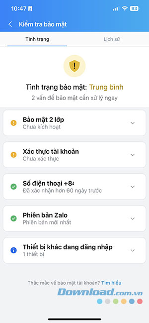 Người dùng chỉ cần chạm vào một vấn đề bảo mật cần xử lý (biểu tượng ! màu vàng), sau đó hoàn thiện kích hoạt, xác thực thông tin theo hướng dẫn để tăng cường bảo mật cho tài khoản Zalo của mình.