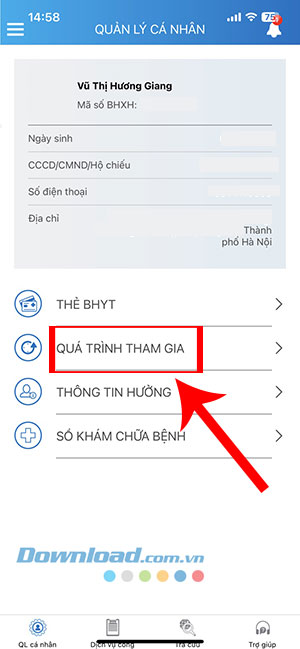 Bước 2: Sau khi đăng nhập, trang Quản lý cá nhân sẽ xuất hiện. Tại đây sẽ xuất hiện các thông tin bảo hiểm như thông tin người dùng, Thẻ BHYT, Quá trình tham gia, Thông tin hưởng và Sổ khám chữa bệnh.