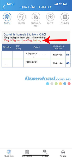 Bước 3: Trong Quá trình tham gia, các loại bảo hiểm sẽ xuất hiện theo từng tab. Mọi người cần xem chi tiết loại nào thì chỉ cần nhấn vào đó. Ví dụ, chọn BHXH thì Tổng thời gian chậm đóng (dòng chữ màu đỏ) sẽ xuất hiện.