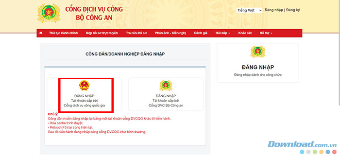 Bước 1: Nếu chưa đăng nhập vào Cổng DVC, hãy truy cập Cổng Dịch vụ công Bộ Công an và nhấn vào Đăng nhập ở góc trên bên phải. Sau đó chọn Đăng nhập tài khoản cấp bởi Cổng dịch vụ công quốc gia.
