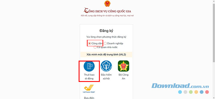 Bước 2: Chọn phương thức đăng ký (Công dân) và cách Xác minh mức độ trung bình (Thuê bao di động). Đây là phương thức đăng ký dễ dàng nhất mà mọi người nên lựa chọn.