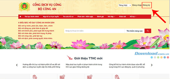 Bước 1: Truy cập Cổng Dịch vụ công Bộ Công An và nhấn vào Đăng ký ở góc trên cùng bên phải.