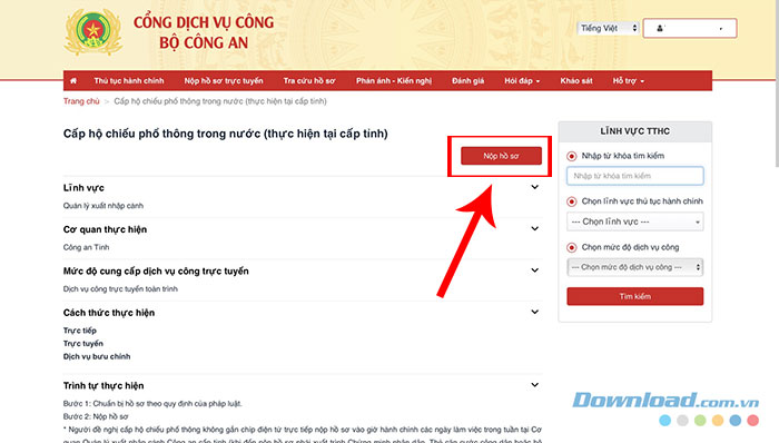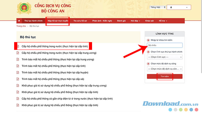 Bước 1: Tại trang chủ Cổng Dịch vụ công Bộ Công an, nhấn vào Nộp hồ sơ trực tuyến. Nhập hộ chiếu vào phần từ khóa tìm kiếm và ấn nút Tìm kiếm.