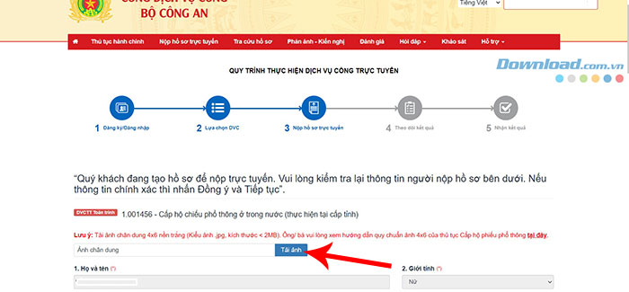 Bước 5: Nhấn nút Tải ảnh để đăng tải ảnh 4x6 theo quy định. Nếu gặp lỗi ở bước này, mọi người có thể tham khảo Cách khắc phục một số lỗi khi tải ảnh chân dung làm hộ chiếu online.