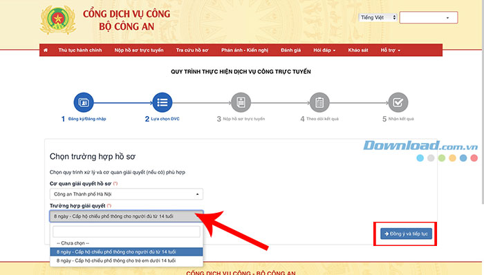 Bước 4: Chọn Cơ quan giải quyết hồ sơ (VD: Công an Thành phố Hà Nội) và Trường hợp giải quyết là Cấp hộ chiếu phổ thông cho người đủ từ 14 tuổi. Sau đó, ấn Đồng ý và Tiếp tục.