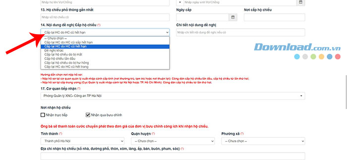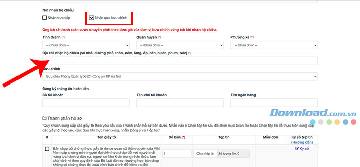 Bước 7: Chọn Nơi nhận hộ chiếu. Nếu muốn nhận kết quả tại nhà, hãy chọn Nhận qua bưu chính và nhập địa chỉ nhận hộ chiếu.