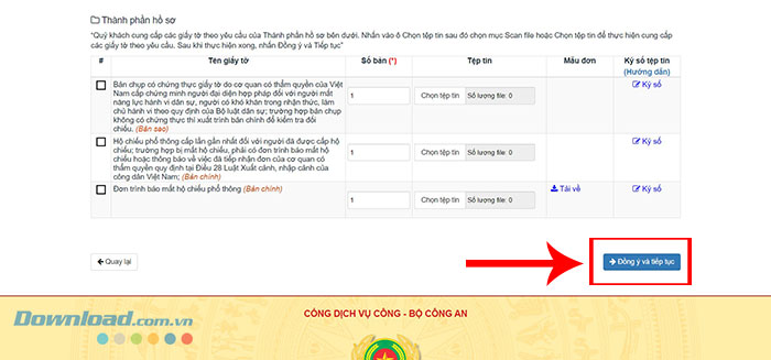 Bước 8: Cuối cùng, kiểm tra lại toàn bộ thông tin để đảm bảo đã điền chính xác, nhấn nút Đồng ý và tiếp tục. Nhập mã xác thực và ấn nút nộp hồ sơ để hoàn tất.
