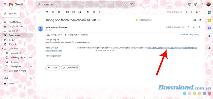 Bước 1: Mở email có tiêu đề Thông báo thanh toán cho hồ sơ và truy cập đường dẫn trong thư.