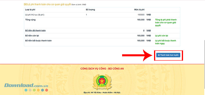 Bước 2: Kiểm tra lệ phí và chọn Thanh toán trực tuyến.