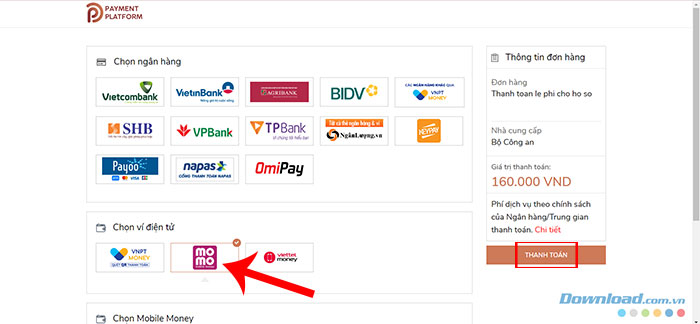 Bước 3: Chọn ngân hàng hoặc ví điện tử được hỗ trợ mà mọi người muốn sử dụng để thanh toán lệ phí và nhấn Thanh toán.