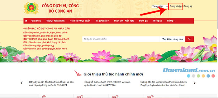 Bước 1: Truy cập Cổng dịch vụ công Bộ Công an và nhấn vào nút Đăng nhập ở góc trên cùng bên phải giao diện chính.